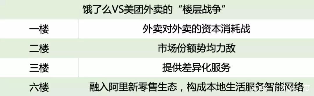 所謂的2樓,其實就是先和美團點評在外賣戰場市場份額“打平”。“打平”之後,繞到其他戰場,再通過高維打低維的方式和美團點評展開競爭。
