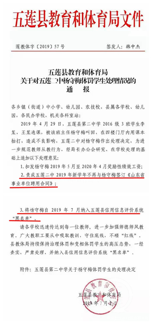 7月2日,五蓮縣教育和體育局又作出《關於對五蓮縣二中楊守梅體罰學生處理情況的通報》。該通報顯示,為進步規範教師從教行為,經局長辦公會研究,在學校處理的基礎上追加以下處理意見:1、扣發楊守梅2019年5月至2020年4月獎勵性績效工資;2、責成五蓮二中2019年新學年不再與楊守梅簽訂《山東省事業單位聘用合同》;3、將場守梅自2019年7月納入五蓮縣信用信息評價系統黑名單。