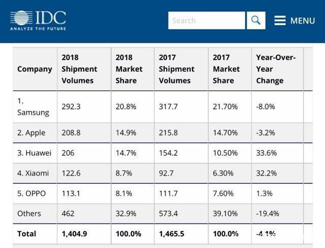 據權威機構IDC發佈的18年全球手機銷量報告顯示:全球排名前5的手機品牌,中國就佔了3個,除了國產品牌有增長,三星蘋果銷量全在下降。