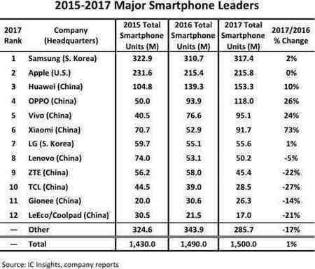 2018年全球手機銷量排名中,前五位有三位是國產公司,而且除了國產公司有增長外,三星、蘋果銷量全在下降。
