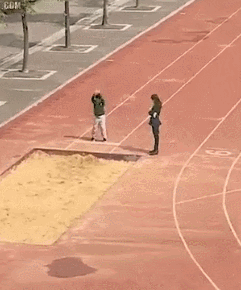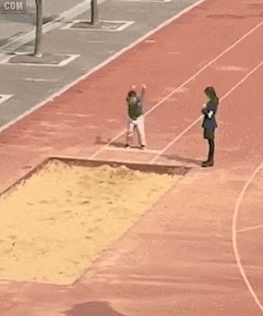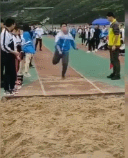下一秒,以為是個王者準備起飛,能看到小學生破吉尼斯紀錄啥的,卻落入了沙坑。對,還是雙腿直接跪下,目測離起點不超過30cm的那種。