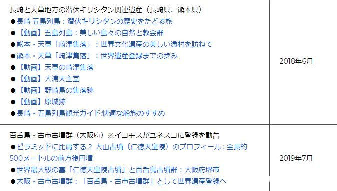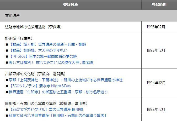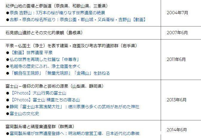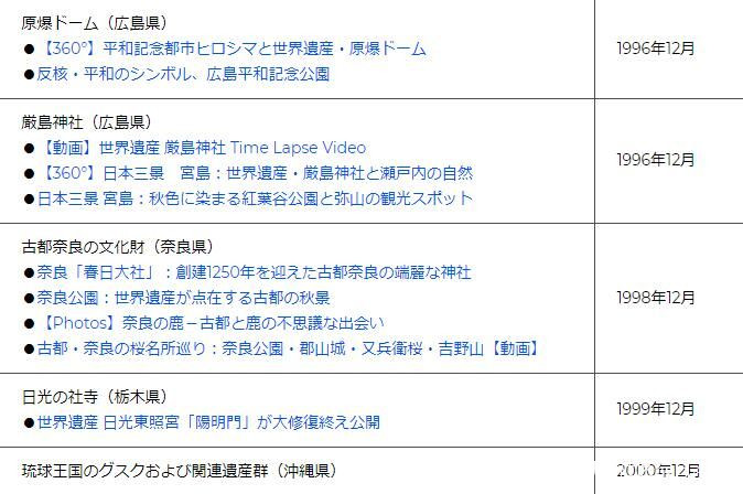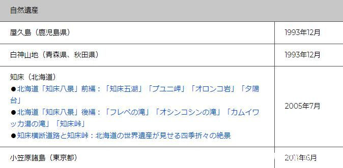 1993年12月,日本法隆寺地區的佛教建築物(奈良縣)和姬路城(兵庫縣)最先為世界文化遺產。之後,2018年“長崎和天草地區的潛伏天主教徒相關遺產”(長崎、熊本兩縣)列入世界文化遺產,日本國內的文化遺產達到了18個。世界自然遺產除了1993年同時登記的屋久島(鹿兒島縣)和白神山地(青森縣、秋田縣)外,還有知牀(北海道)、小笠原諸島(東京都)共4個。