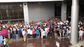 7月9日清晨7點,數百位家長與小學生彙集於上海世博展覽館內。