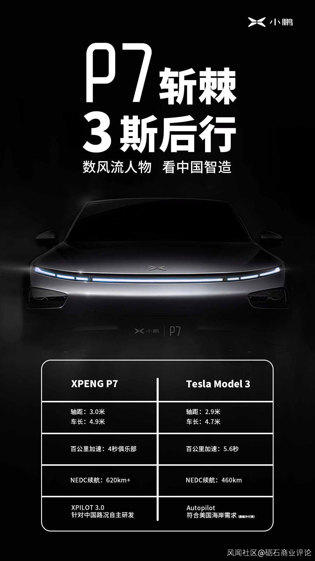 何小鵬還表示,小鵬P7的續航能力目標是640km,遠超特斯拉Model 3的460km。更有意思的是,小鵬汽車還發布了一張具有挑釁意味的宣傳海報,上面寫着“P7斬棘,3期後行”,另有一段小字為“數風流人物,看中國智造”……明晃晃地博眼球。