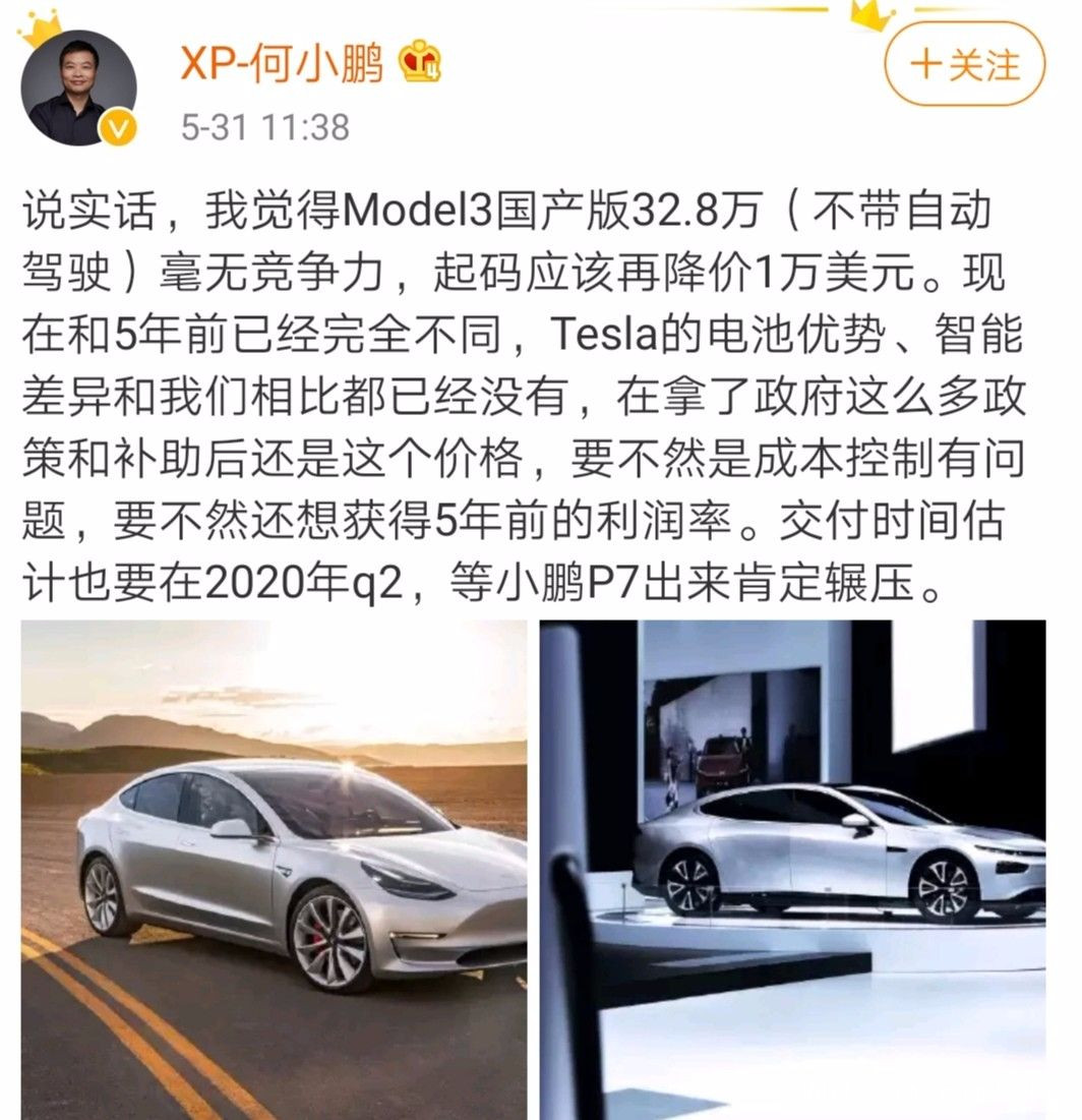 他在社交媒體上説,特斯拉這個價格沒有競爭力,等小鵬P7出來可以碾壓特斯拉。而實際上小鵬P7距離何小鵬對外宣稱的量產時間還要一年多,即便一切順利,比特斯拉Model 3宣佈的量產時間也要至少晚上半年,單就量產交貨時間來説,小鵬汽車就沒有任何優勢。