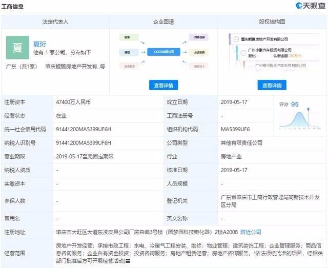 在進軍網約車業務的幾乎同一時間,小鵬汽車還進軍了房地產業務。5月17日,廣州小鵬汽車投資有限公司新增對外投資,成立肇慶鯤鵬房地產開發有限公司,該公司註冊資本47400萬元人民幣,法定代表人為小鵬汽車創始人兼總裁夏珩,同時出任該公司董事長、總經理,大股東為廣州小鵬汽車投資有限公司,持股比例73.84%。