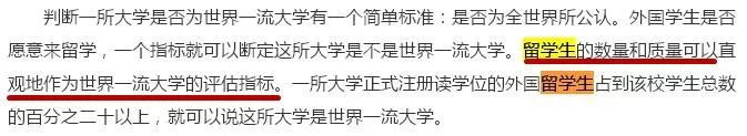 如果留學生數量和質量真的是“世界一流大學”的“直觀的”評估指標,那麼,不管是不是“世界一流大學”的高校肯定都要參照“世界一流大學”的標準去做,怎麼説,這也算是要求進步的表現吧?不過,留學生的質量總是一時半會很難提高的,既然質量很難迅速提高那就只能先在數量上想辦法了。