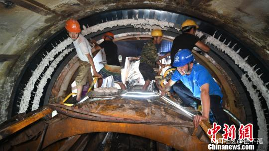 工人們正在40℃高温的盾構機倉內檢修設備。 韓蘇原 攝