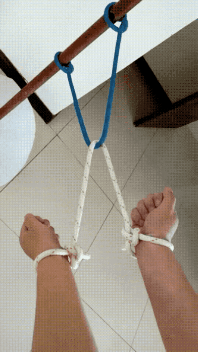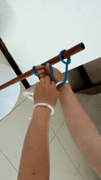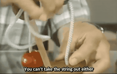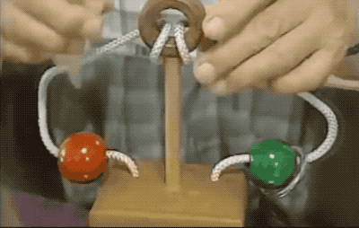 這個遊戲的目標是,讓右邊的那個圓環和左邊的圓環貼在一起。不能把木條弄斷,也不能把繩子剪斷。