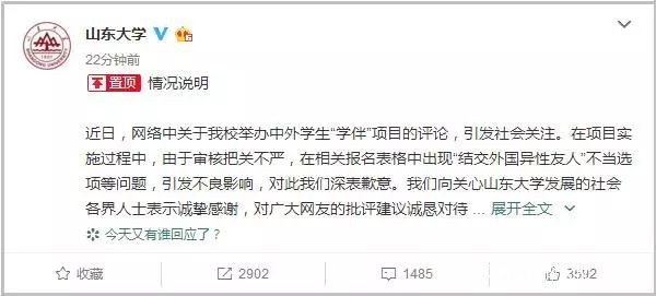 隨“福州外籍學生襲警無罪”一起發酵的,還有山東大學的“異性學伴”事件。根據網友爆料,為了吸引外籍學生,山東大學官方組織本校學生開展“學伴活動”,每1名外籍留學生配備3名中國學生作為其學伴,而令人難以接受的是,在山東大學招募中國學生作為學伴的活動表格中赫然寫着:結交外國異性友人。