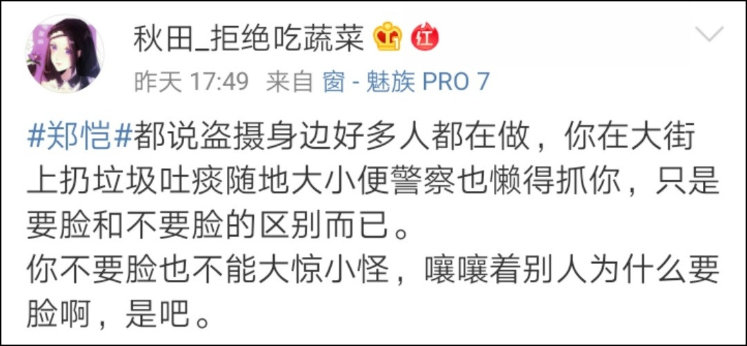 反對鄭愷做法網友一直想表達的是,鄭愷身為公眾人物,身為行業中人應該考慮個人影響力,給公眾起到榜樣示範作用。