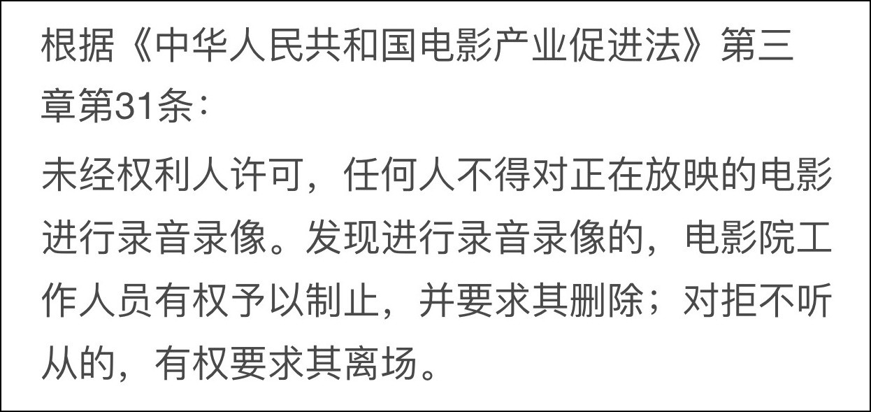 根據《中華人民共和國電影產業促進法》第三章第31條之規定,未經權利人許可,任何人不得對正在放映的電影進行錄音錄像。發現進行錄音錄像的,電影院工作人員有權予以制止,並要求其刪除;對拒不聽從的,有權要求其離場。
