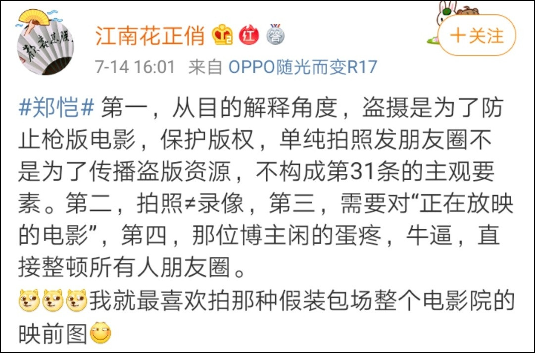 法規明確的是“正在放映的電影”,而鄭愷拍攝的時候,正片內容並沒有開始。另外,從法規制定目的角度來講,《電影產業法》第31條的出台是為了保護知識版權,防止槍版影片的出現,鄭愷發佈微博分享觀影經歷其實和我們普通人發朋友圈是一樣的性質,都沒有在主觀上想要去傳播盜版資源。