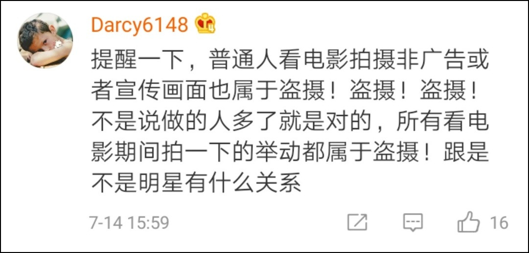這些網友還指出,平時我們走進電影院,都會不自覺地拿出手機來拍攝幾張照片,以備影片結束後發朋友圈,這並無不妥。