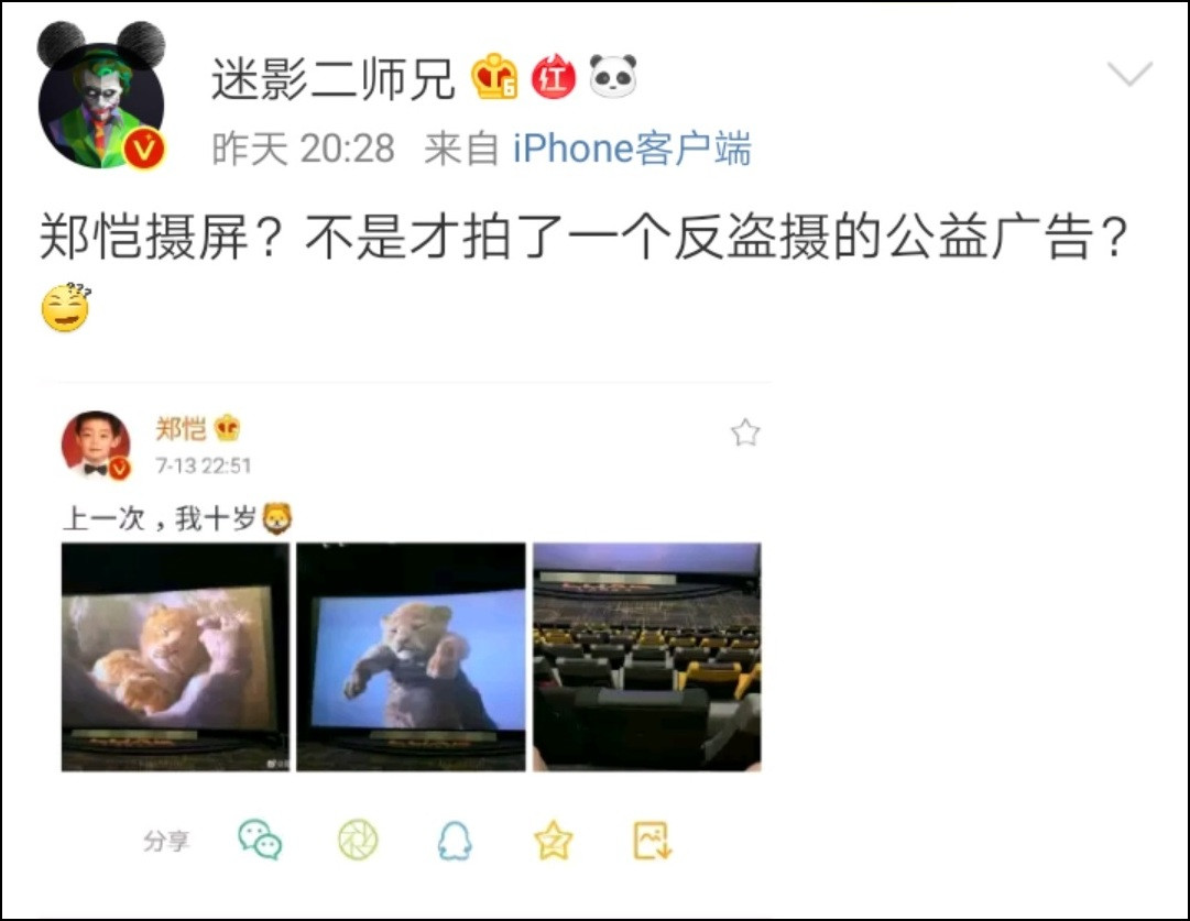 不過,鄭愷的微博配圖卻顯示他在影院內使用手機拍攝,疑似違法盜攝。