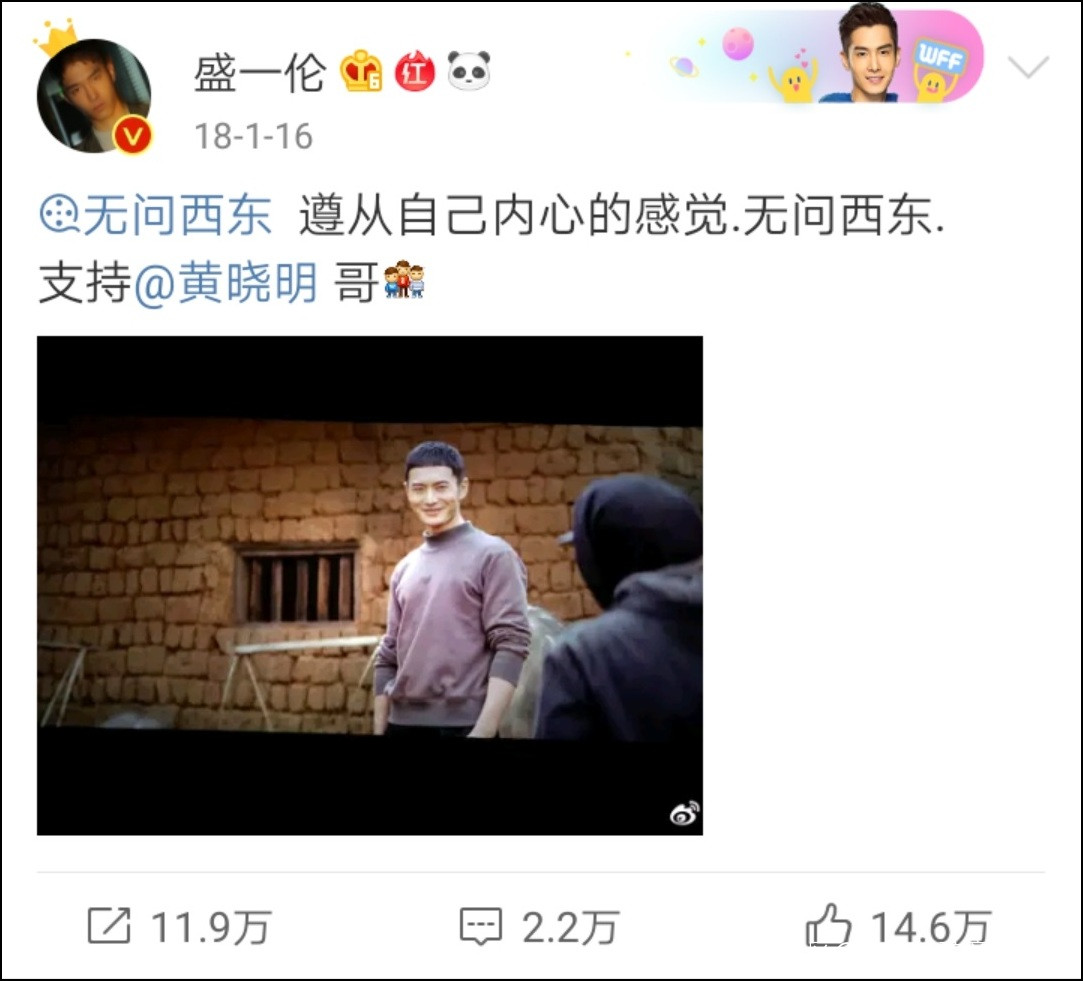 去年1月,演員盛一倫在支持黃曉明主演的電影《無問西東》時,也因為配圖遭到網友炮轟。