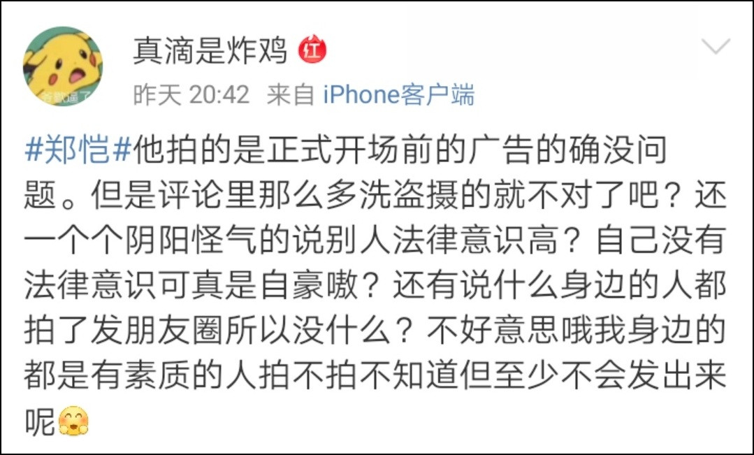 他們指出,鄭愷拍攝的是影片正式放映前的貼片廣告,並且這兩個鏡頭都在預告中出現過,不能被認為是盜攝。影院內的場燈都還亮着,也足以説明這一點。