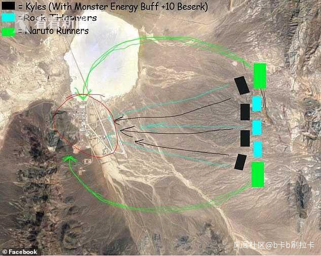組織者還邀請全球各地的外星人迷戀者,採用“火影跑”的方式闖入“51區”,因為這種姿勢可以比子彈跑得還快。 (注:“火影跑”是指日本動漫《火影忍者》中忍者跑步的姿勢,即把雙手舉在背後跑步。)