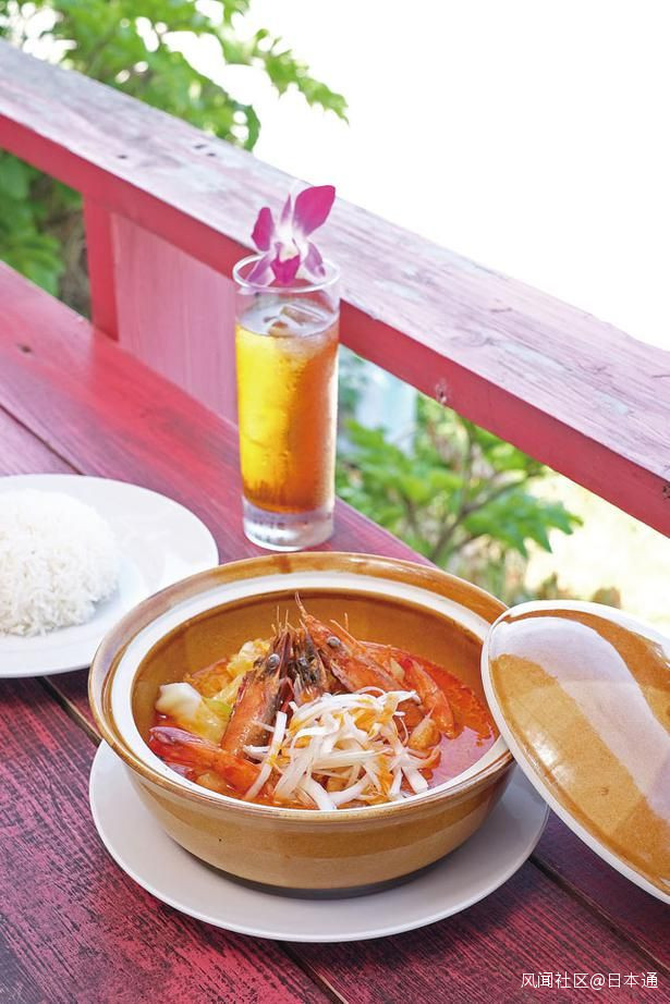 大量使用糸島食材和在自家農園種植的泰國香草等烹飪料理,健康且辛辣十足。紅咖喱蝦(1690日元,約107.6元)能感受到濃厚的蝦味和蔬菜的甜味,辣的程度比看上去要温和,恰到好處。從眼前廣闊的陽台上以看到海面上的日落。
