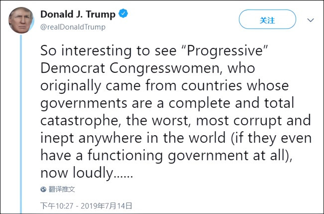 “那些民主黨‘進步’女議員真的很有趣。她們原本來自那些世界上最糟糕、腐敗、無能的政府控制下的國家(或者連個正常運作的政府都沒有),現在卻要來惡毒地教美國,這個地球上最偉大和強大的國家的民眾,如何運作我們的政府。