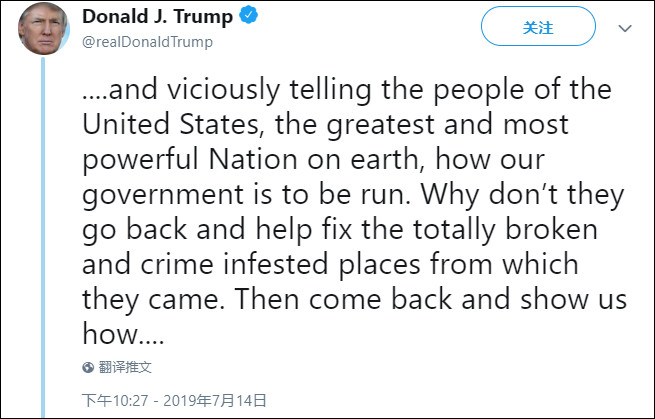 在邊境拘留營的惡劣環境被曝光,並因此遭受抨擊之後,特朗普於當地時間7月14日晚間在社交媒體上連發三條推文,對民主黨議員開火,要她們“回自己的國家去”。