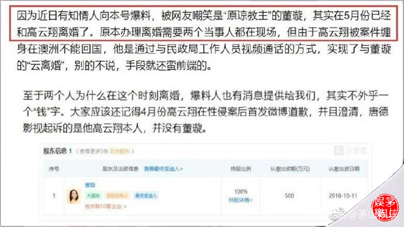 有網友稱,近日接到知情人爆料:“被網在嘲笑是‘原諒教主’的董璇,其實在5月份已經和高雲翔離婚了。原本辦理離婚需要兩個當事人都在現場的,但由於高雲翔被案件纏身在澳洲不能回國,他是通過與民政局工作人員視頻通話的方式,實現了與董璇的‘雲離婚’,別的不説,手段就還滿前端的”。網友還稱,爆料人稱,這對夫妻在這個時刻離婚,理由無外乎一個“錢”字。爆料一出,多家媒體聯繫雙方工作人員,均未得到回應。