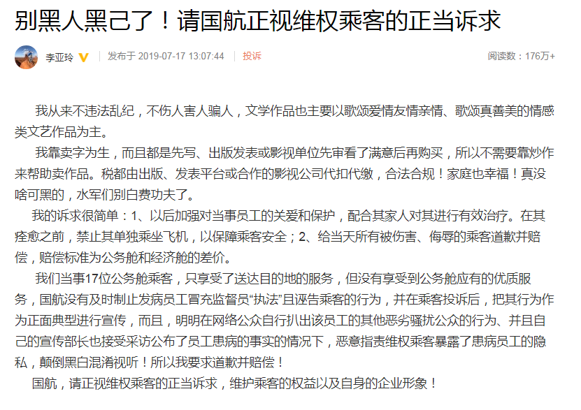 17日午間,李亞玲發表微博文章《別黑人黑己了!請國航正視維權乘客的正當訴求》。要求國航給當天所有被傷害、侮辱的乘客道歉並賠償,賠償標準為公務艙和經濟艙的差價,並要求禁止“監督員”牛宇虹單獨乘坐飛機。