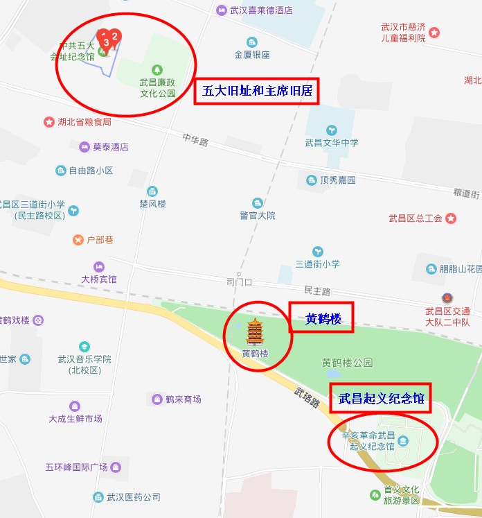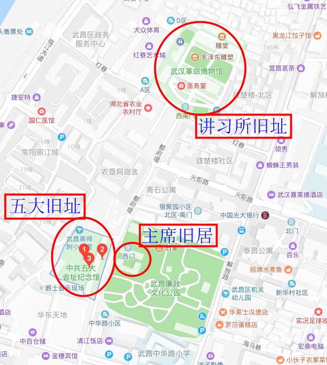 另外,這三處和黃鶴樓、武昌起義紀念館也都不遠,直線距離在2公里內。5個地方加起來,一天時間正好,行程非常適合時間緊湊的人。五大舊址和主席舊居沒有車位,講習所舊址門口車位太少,停車不方便,最好是打車。