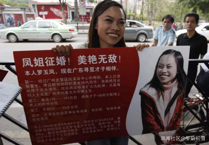 羅玉鳳,人稱鳳姐。她號稱自己的智商是前後 300 年無人能匹敵,自小博覽羣書,琴棋書畫樣樣行。以她對自我的描述,足以稱得上 " 學神 " 了。2009 年,鳳姐在上海陸家嘴公開徵婚。鳳姐的徵婚條件多達七條,其中兩個是:1. 必須為倫敦或哈佛大學碩士畢業生。必須博士生連讀,中途無跳級,不留級,不轉校。在外參加工作後再回校讀書者免;2. 身高 176--183 左右。長得越帥越好。必須有劉德華那樣的帥氣、任達華那樣的性感、立威廉那樣的俊俏、謝霆鋒那樣的冷酷、以及韓寒那樣的才氣。
