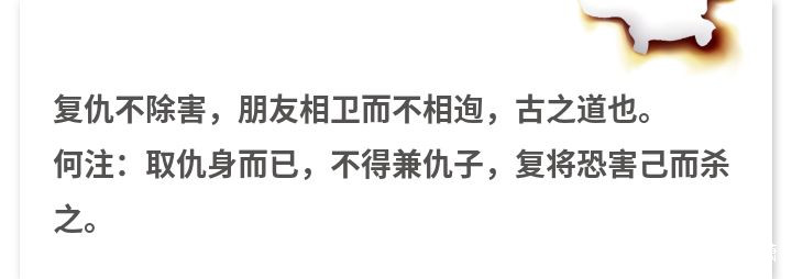 大意也就是説如果父親是無辜被殺,兒子報仇是可以接受的,否則復仇是不正當的,只會導致無限循環的惡意相殺。強調復仇必須具有正義性。