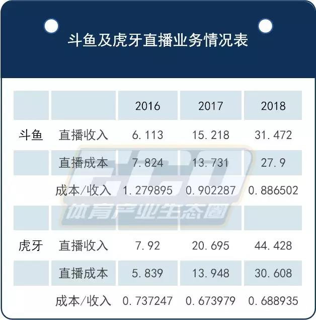 經過比對,我們發現,在2018年,鬥魚和虎牙的這一比值分別為0.887和0.689。也就是説,在同樣直播收入一塊錢的情況下,鬥魚的成本是接近9毛錢,而虎牙的成本接近7毛錢。在兩家公司數十億的營收規模上,這兩毛錢的差距讓兩個平台的財務狀況截然不同。
