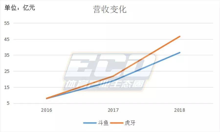 我們可以看到,在2016年,鬥魚和虎牙營收處於同一水平;2017年,虎牙營收已超出鬥魚近3億元,而到了2018年,虎牙的營收超過鬥魚約10億元。