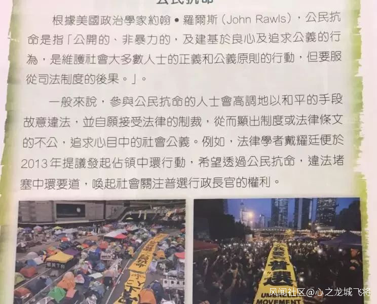 由齡記出版有限公司出版的《初中新思維通識單元2:今日香港》(第二版)第65頁解釋“公民抗命”時,以“佔中三子”之一、港大法律系副教授戴耀廷為例子,將戴耀廷發起“佔中”的目的進行美化、洗白。