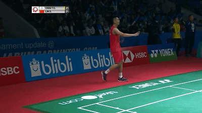 當雙方戰成19平,林丹依靠平抽擋得分,20比19,林丹率先拿到局點。周天成在場面略顯被動時挑了一個後場高球,林丹站位有些靠前,沒有打到,雙方戰成20平。林丹下壓進攻得分再次拿到局點,周天成接發球落在後場邊線附近,林丹判斷出界沒有揮拍,司線示意界內,雙方戰成21平。林丹對這一判罰感到難以置信,中國隊教練也起身向裁判表示難以接受,從鏡頭回放來看,這個球的確有出界的嫌疑。由於主辦方寄丟鷹眼器材,作為超級1000賽事的印尼公開賽至今仍無法為球員提供鷹眼挑戰機會。