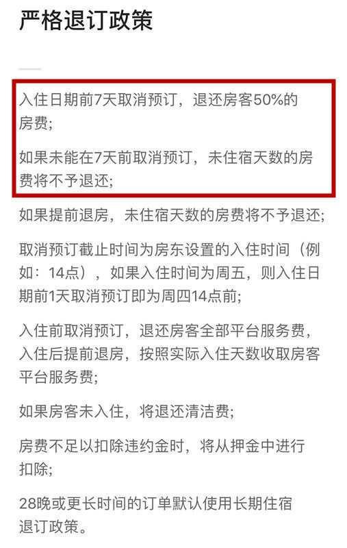 針對雙方爭議點,荔枝新聞隨後先檢索了兩人交易的民宿平台,發現退訂政策裏確實有明確規定:“入住日期前7天取消預定,退還房客50%的房費;如果未能在7天前取消,未住宿天數的房費將不予退還。”