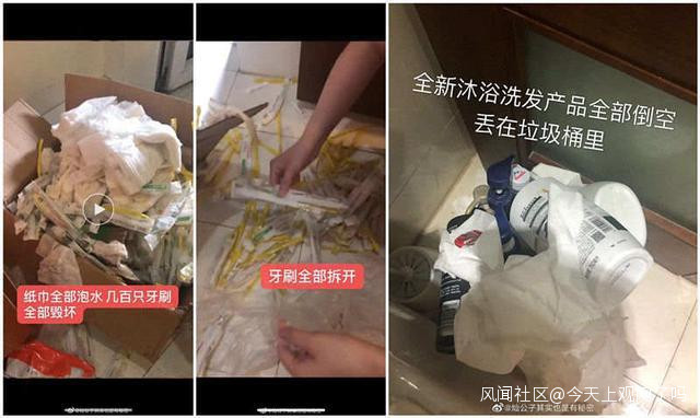 根據房東陳陽的陳述,7月16日中午,王可退房後,保潔工進入房間打掃看到了驚人一幕。“鑰匙孔被膠水堵住,幾百只牙刷全部撕開,一箱餐巾紙全部被水泡,所有新換的沐浴洗液產品全部被倒空丟進垃圾桶……”