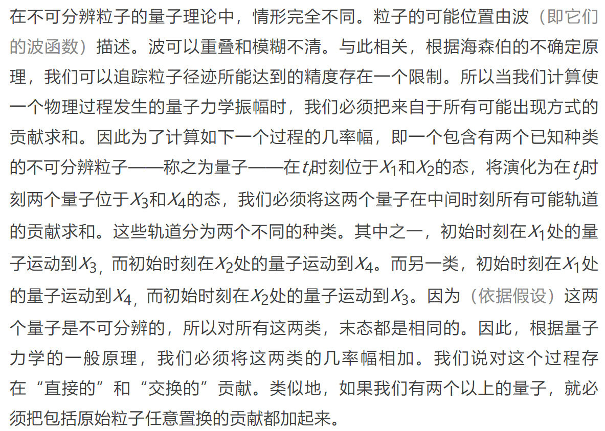 考慮到一種基本粒子的不可分辨性,包括它們的相互作用在相互交換下的完全不變性,量子力學的普遍原理告訴我們,形成交換對稱羣任意表示的解在時間上保持這種性質。但它們不限制哪個表示被實現。量子場論不僅解釋了不可分辨粒子的存在和它們的相互作用在交換下的不變性,也限制瞭解的對稱性。存在兩種可能性,玻色子或費米子。對玻色子來説,只有恆等表示是物理的(對稱的波函數);對費密子來説,只有一維奇表示是物理的(反對稱的波函數)。量子場論還有個自旋-統計定理,根據這個定理具有整數自旋的粒子是玻色子,而具有半奇數自旋的粒子是費米子。當然,費米子遵從費米的狀態計數程序。例子是電子、質子、中子、夸克以及其他帶電輕子和中微子。在這裏不太適宜評述證明了前一段斷言的量子場論基本原理。但一個簡短的啓發性討論是恰當的。
