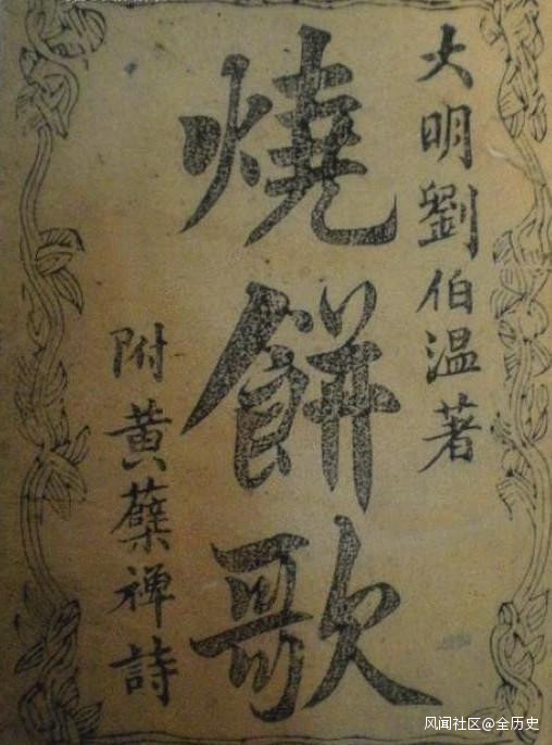 待劉伯温坐定,朱元璋就問:“先生深明數理,可知碗中是何物。”劉伯温掐指輪算,回答:“半似日兮半似月,曾被金龍咬一缺,依臣之見這碗中乃燒餅是也。” 君臣二人開始一問一答,劉伯温最終吐露出一系列預言。這些預言,被當時人記錄下來,後世便稱其為《燒餅歌》。