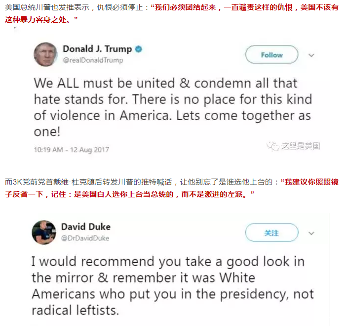 貝拉米等人挑起夏洛茨維爾市的種族主義衝突與暴亂,並迅速點燃了波士頓、新奧爾良等數個城市。為保持“政治正確”,特朗普迫不得己站出來指責種族主義,稱“種族主義是邪惡的”,批評新納粹團體、3K黨、白人至上主義者是罪犯和惡棍!而話音剛落,3K黨前黨首戴維·杜克打臉特朗普,“我建議你照照鏡子反省一下,記住:是美國白人選你上台當總統的,而不是激進的左派。”(注:左派,指黑命貴等有色族裔)。