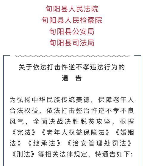 7月17日,陝西省安康市旬陽縣“平安旬陽”公眾號發佈《關於依法打擊忤逆不孝違法行為的通告》。通告中明確,“子女住新房,任其老人住舊房危房”“對老人生活不管不顧”“霸佔老人一折通”“在贍養父母老人的義務上互相推諉”等六種忤逆不孝的情形將受到依法打擊整治。