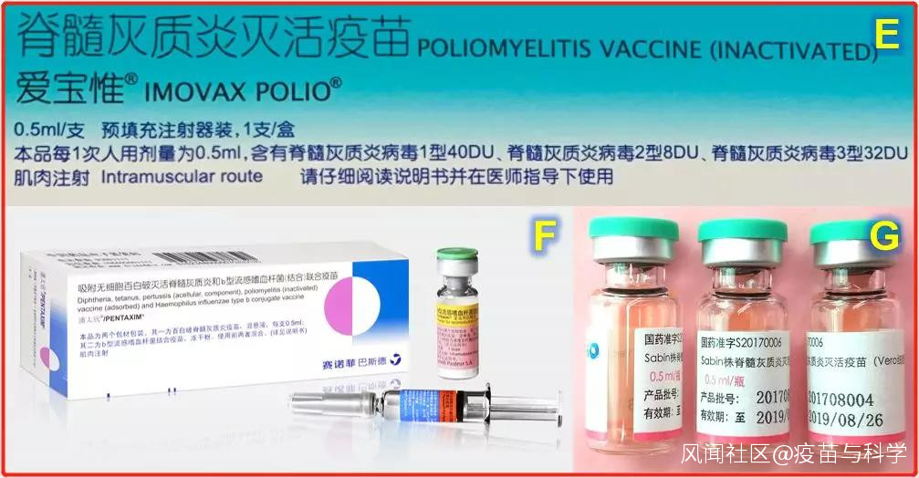 再來説説滅活疫苗,縮寫是IPV。序號E、F、G都是IPV,按上市的先後順序排列,F是含有IPV的聯合疫苗。