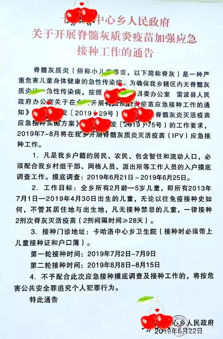 在四川省衞健委公告前,中國疾控中心已經緊急向涼山地區調撥160萬支脊灰滅活疫苗,準備給當地兒童進行應急補種。當地某鄉政府發佈公告稱:如果不配合這次應急接種,將被追究危害公共安全罪。