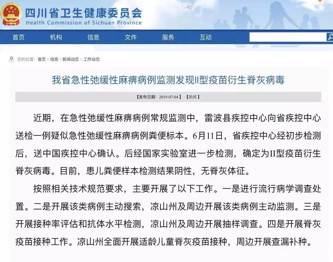 2019年7月4日,四川省衞健委網站宣佈,在涼山州雷波縣的急性馳緩性麻痹病例的糞便中分離到1株脊灰Ⅱ型疫苗衍生病毒。脊灰,就是小兒麻痹症,是指野生脊灰病毒引起的永久性肢體癱瘓。