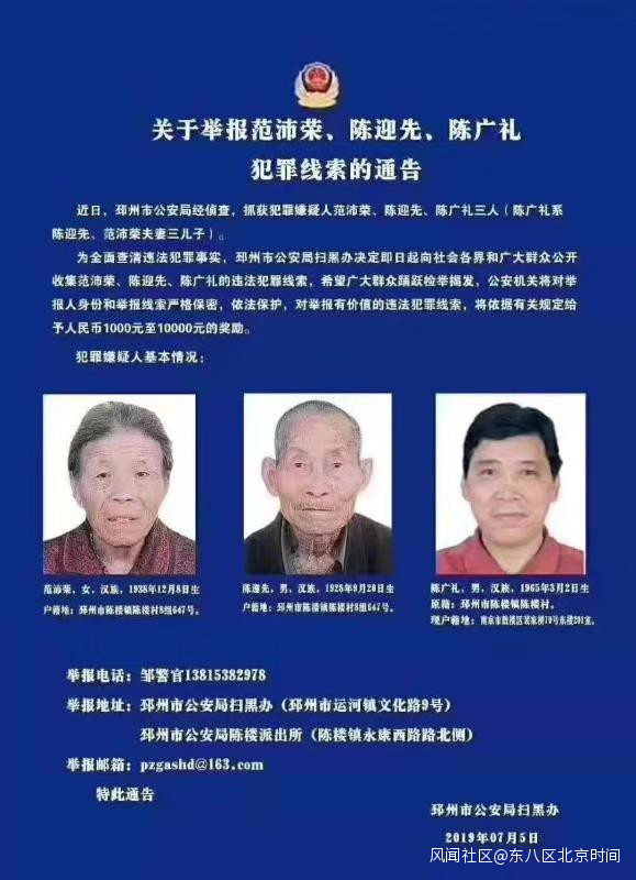 邳州市公安局掃黑辦的這則犯罪線索徵集通告,發佈於7月5日,文內稱,邳州市公安局經偵查,抓獲犯罪嫌疑人陳迎先、範沛榮、陳廣禮三人(陳廣禮系陳迎先、範沛榮夫妻三兒子)。警方為全面查清三人違法犯罪事實,向社會各界和廣大羣眾公開收集其違法犯罪線索。對舉報有價值的違法犯罪線索,警方將給予人民幣1000元至10000元的獎勵。