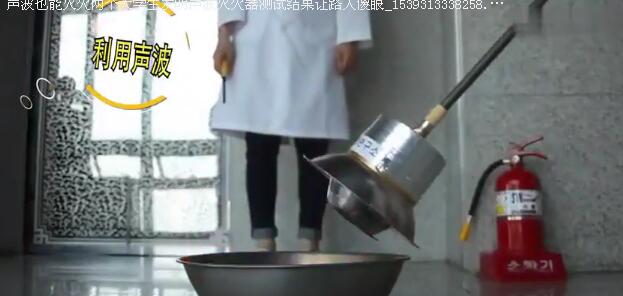 首先是手持型的,是美國喬治梅森的兩個年輕人發明的(看視頻是一個華裔和一個非洲裔),感覺像是背了一套9公斤的低音炮,發射的是30到60(大概是hz)的低頻聲波,據説能隔絕氧氣,還真是對準哪裏哪裏就滅火了: