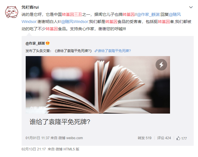 2019年7月8日,觀察者網首頁轉發了央視新聞的一篇報道,標題是《中國不缺糧?袁隆平:別國不賣,就麻煩了》,在文章中,我國著名水稻專家袁隆平表達了對進口糧食作物的擔憂,並立志為中國糧食和農業貢獻自己的力量,妥妥正能量。新聞底下觀網的許多網友也表達了對袁隆平老先生的敬意。然而,在這些評論中,有一些渾水摸魚別有用心之人,將這個新聞和袁隆平,硬生生的與轉基因社會爭論問題掛鈎,並顛倒黑白抹黑稱“挺轉者失去理智,開始攻擊袁隆平”,並扣挺轉人士為“為了推銷轉基因,純粹為了利益,為資本服務”。甚至還有一個自稱“生物醫藥人士”人聲稱“挺轉造謠袁隆平”。