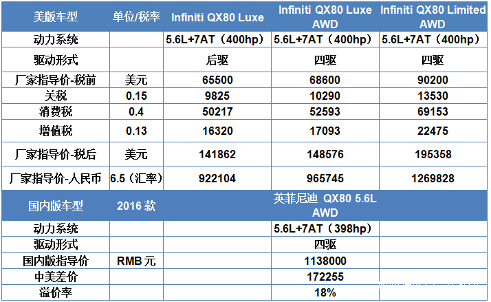 上圖為QX80中美主要車型和價格對比表,從中我們可以看到: