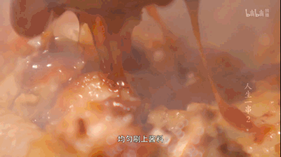 等正式烤制時,塗抹獨特的花生醬,再灑上白芝麻。
