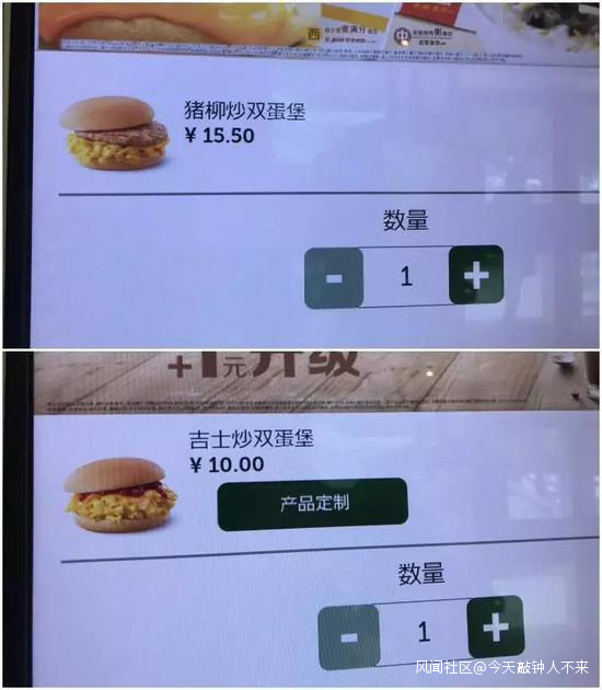 而在北京市海淀區阜成路麥當勞店裏,記者在自助點單機上看到,兩款蛋堡的的價格分別為15.5元和10元,分別與麥樂送價格差0.5元和1元。