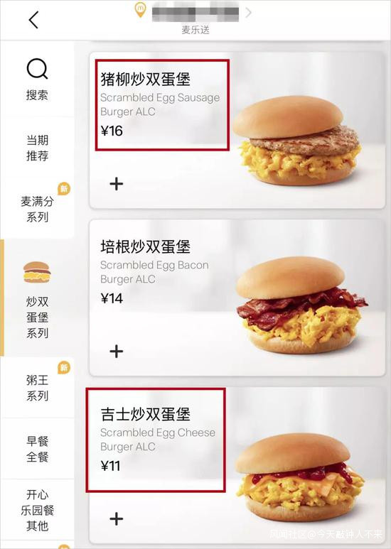 7月19日早上,記者先在麥當勞App上看到,麥樂送外賣平台上,“豬柳炒雙蛋堡”的價格為16元,“吉士炒雙蛋堡”為11元。
